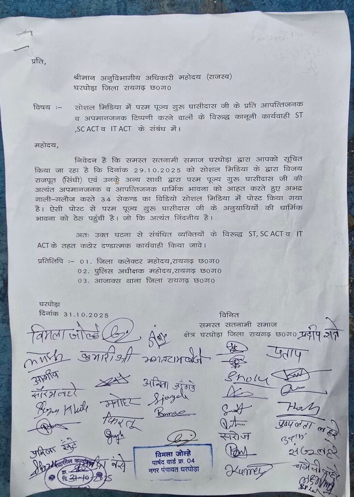 घरघोड़ा (रायगढ़) 31 अक्टूबर 2025। सोशल मीडिया पर विजय राजपूत नामक व्यक्ति व उसके साथियों द्वारा परम पूज्य गुरु घासीदास जी के प्रति आपत्तिजनक व अपमानजनक टिप्पणी किए जाने के विरोध में सतनामी समाज घरघोड़ा ने शुक्रवार को गहरी नाराजगी व्यक्त की। इस संबंध में समाज के प्रतिनिधियों ने अनुविभागीय अधिकारी (राजस्व) घरघोड़ा को ज्ञापन सौंपते हुए आरोपियों पर एससी/एसटी एक्ट एवं आईटी एक्ट के तहत सख्त कानूनी कार्रवाई की मांग की।