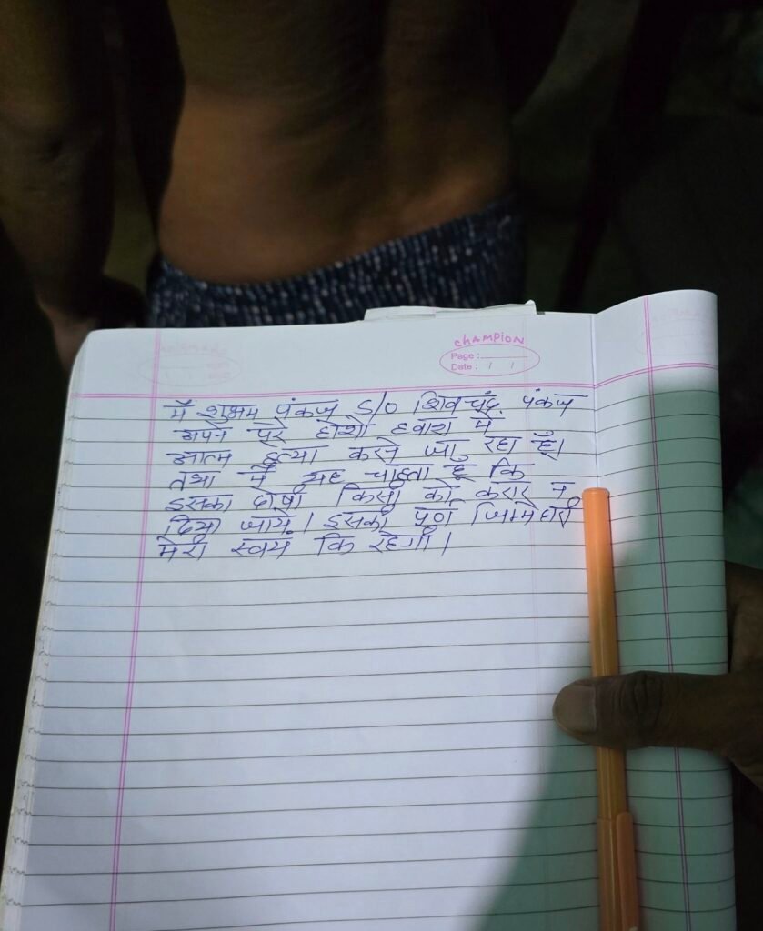 “मैं शुभम पंकज पिता- शिवचंद पंकज, अपने पूरे होशो-हवास में आत्महत्या करने जा रहा हूं। तथा मैं यह चाहता हूं कि इसका दोषी किसी को करार ना दिया जाए, इसकी पूर्ण जिम्मेदारी मेरी स्वयं की रहेगी।”