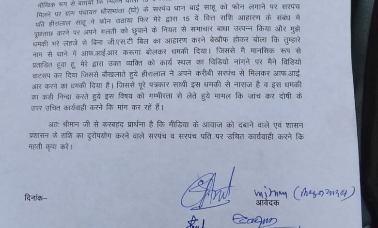 धौराभाठा में सरपंच पति की पत्रकार को धमकी से मचा बवाल, पत्रकार संघ ने जताया विरोध, जांच का मिला आश्वासन