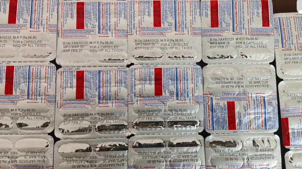 तलाशी लेने पर स्कूटी की डिक्की में एक प्लास्टिक थैली में रखे 30 पत्ता में कुल 720 नग प्रतिबंधित SPASMO PROXYVON PIUS कैप्सूल बरामद हुए। जब आरोपियों से दवाओं के संबंध में वैध दस्तावेज मांगे गए तो वे प्रस्तुत नहीं कर सके।