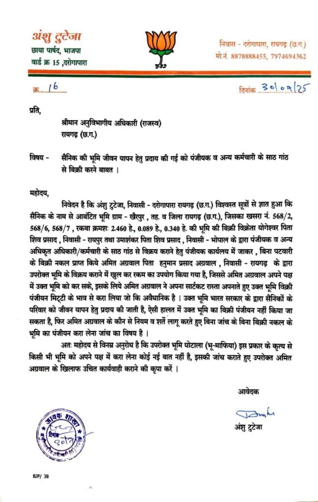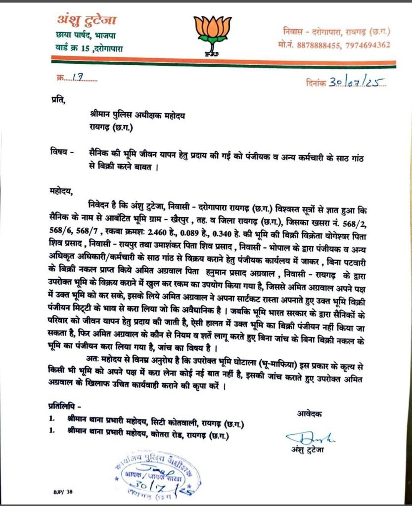 रायगढ़ 30 जुलाई 2025। रायगढ़ जिले के ग्राम खैरपुर की एक भूमि को लेकर नया विवाद सामने आया है। वार्ड क्रमांक 15 के भाजपा छाया पार्षद अंशु टुटेजा ने पुलिस अधीक्षक एवं राजस्व विभाग के अनुविभागीय अधिकारी को ज्ञापन सौंपकर आरोप लगाया है कि शासन द्वारा पूर्व सैनिक को जीवन यापन के लिए प्रदत्त भूमि का अवैध रूप से पंजीयन कर बिक्री की जा रही हैं।