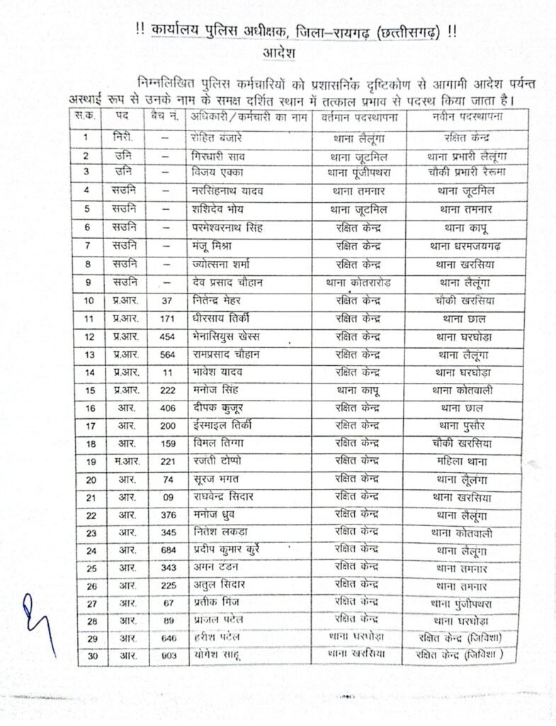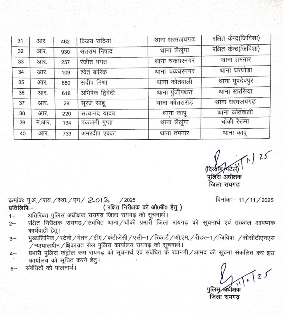 रायगढ़ 12 नवंबर 2025। रायगढ़ पुलिस अधीक्षक श्री दिब्यांग कुमार पटेल ने जिले में प्रशासनिक कसावट लाने एवं पुलिस कार्यप्रणाली में गतिशीलता लाने के उद्देश्य से बड़े पैमाने पर तबादले किए हैं। जारी आदेश में निरीक्षक से लेकर आरक्षक तक के अधिकारियों-कर्मचारियों को स्थानांतरित किया गया है।